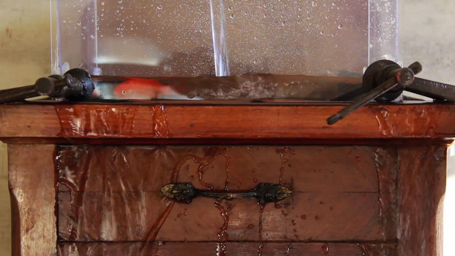 Two fish live in temporary aquarium however it is not able to hold back the water. The water continually enters and exits and it’s just enough to sustain the lives of the fish.